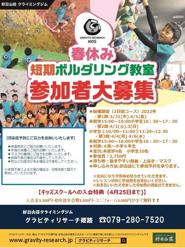 皆さまこんにちは♪ GR姫路です! 冬休みに大好評だったボルダリング教室を春も開催いたします♪ 日程は2日間コース! 第2期(4/2.4/3)は小学生枠のみですが 10:00クラスと11:30クラスが選べるので 参加しやすいですね^^ 短期教室に参加してから入会すると…
